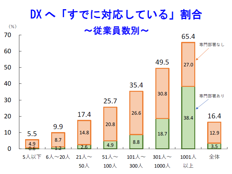 DXへ「すでに対応している」企業の割合を従業員数別にみると、「1001人以上」の大企業では65.4%と企業の約3分の2にのぼりました。そのうち、専門部署がある企業は38.4%、専門部署がない企業は27.0%となり、前者が後者を10ポイント以上上回りました。