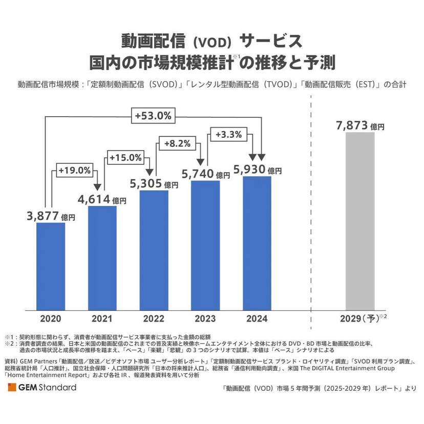 2024年、動画配信(VOD)サービス全体の国内市場規模は推計5,930億円(前年比+3.3%)と成長が鈍化