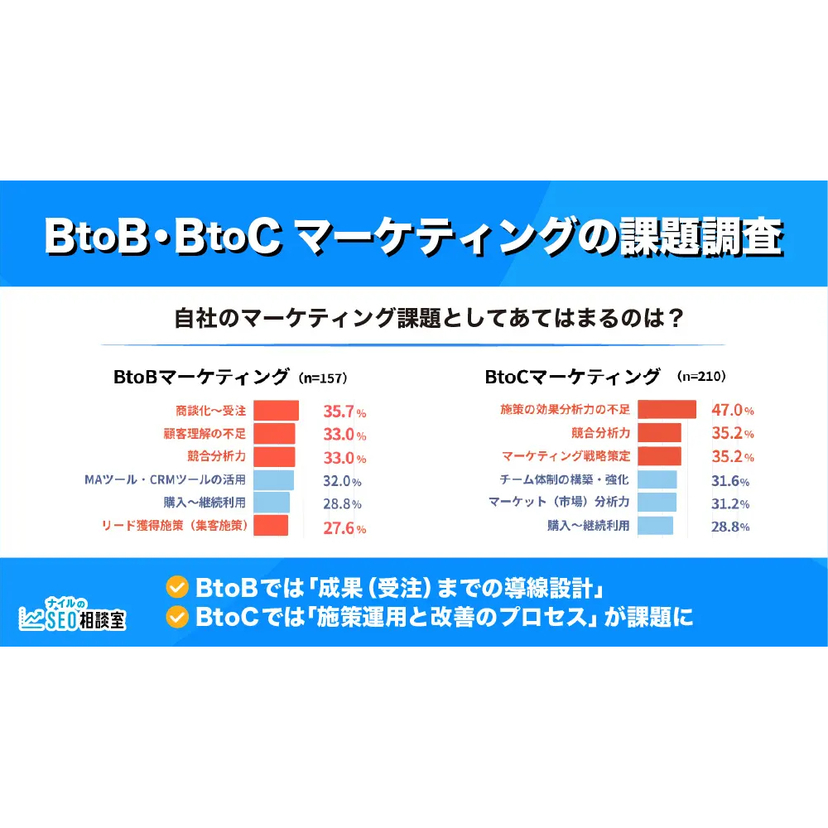 https://www.seohacks.net/column/28695/マーケティング活動において、BtoB企業とBtoC企業とでは、戦略の立て方や注力する施策は大きく異なります。 各社のマーケティング担当者を対象に、マーケティングの課題に関するアンケート調査を実施。BtoB企業・BtoC企業それぞれの特徴や傾向の違いを読み解きます。