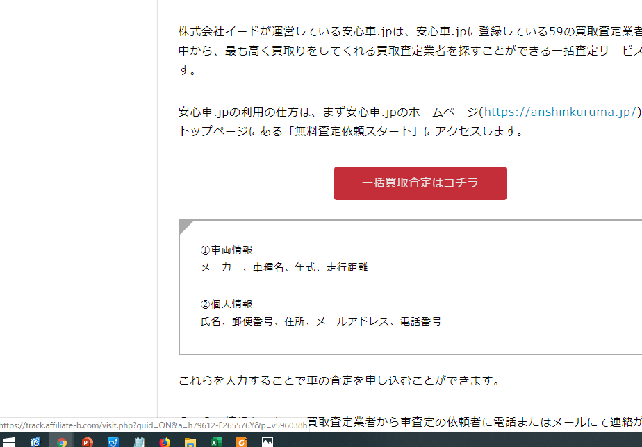 Googleなどの検索エンジンで「安心車 評判」などと検索するとアフィリエイトサイトが複数検索結果に出てきます。そのサイトの中で「公式サイトはこちら」というようにリンクが貼ってある箇所にマウスのカーソルを重ねると、ブラウザ右下にリンク先のURLが出てきます。